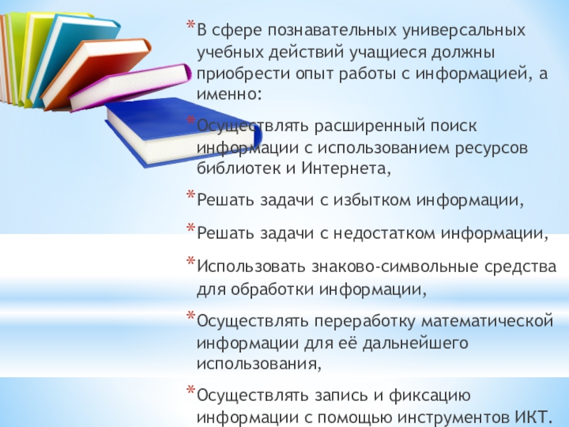 В сфере познавательных универсальных учебных действий учащиеся должны приобрести опыт работы с информацией, а именно:Осуществлять расширенный поиск