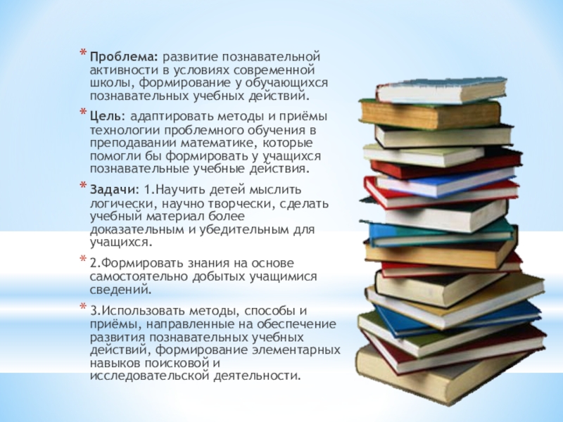 Цель: адаптировать методы и приёмы технологии проблемного обучения в преподавании математике, которые помогли бы формировать у учащихся познавательные учебные действия.