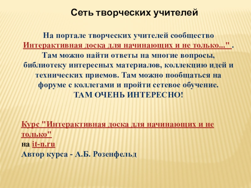 На портале творческих учителей сообщество Интерактивная доска для начинающих и не только..." . Там можно найти ответы на многие вопросы, библиотеку интересных материалов, коллекцию идей и технических приемов. Там можно пообщаться на форуме с коллегами и пройти сетевое обучение.