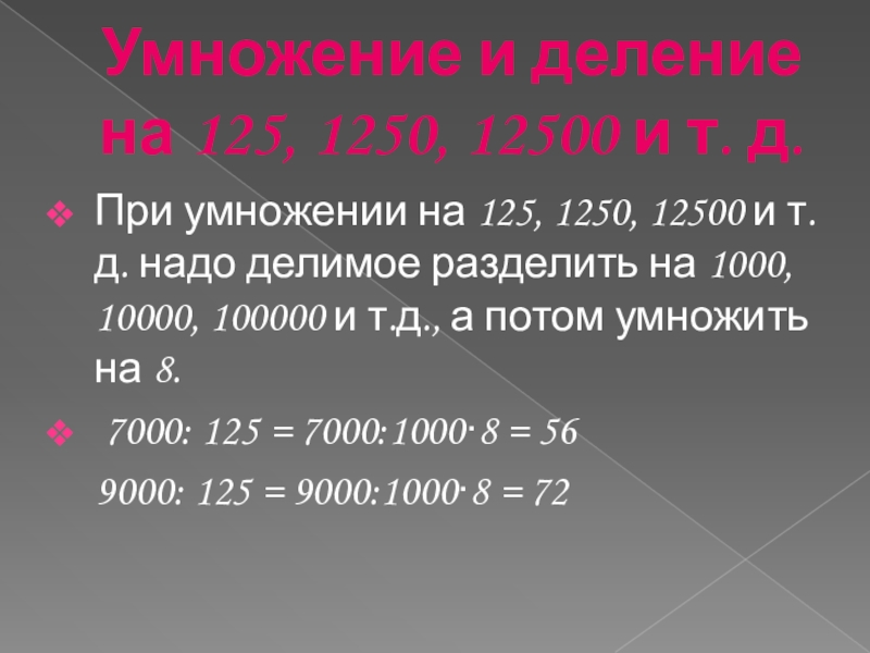 Слайд 16Умножение и деление на 125, 1250, 12500 и т. д.