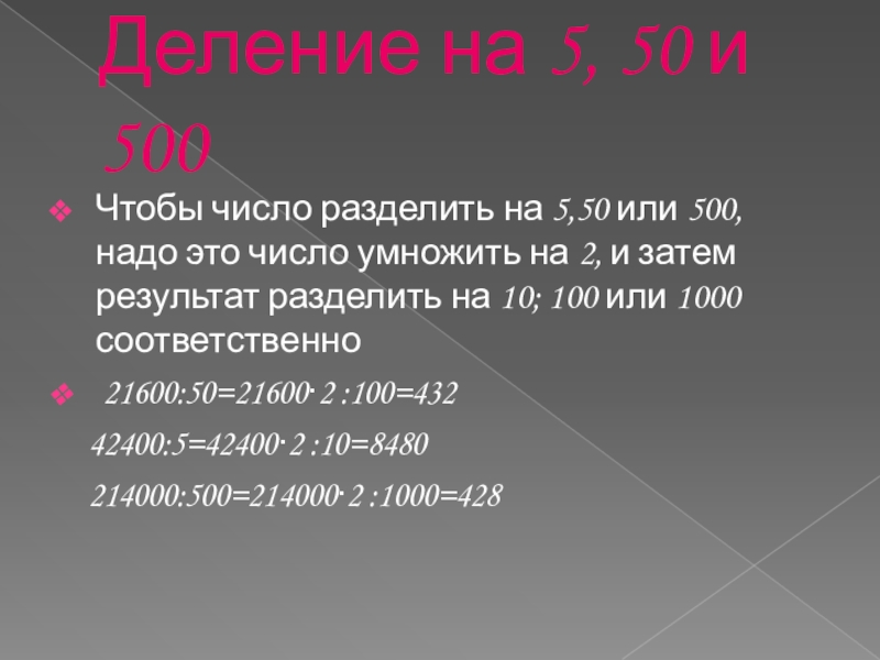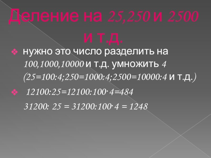Слайд 15Деление на 25,250 и 2500 и т.д.