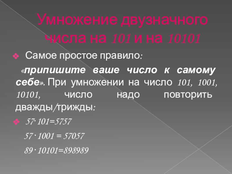 ваше число к самому себе». При умножении на число 101, 1001, 10101, число надо повторить дважды/трижды: