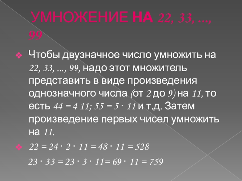 33, ..., 99, надо этот множитель представить в виде произведения однозначного числа (от 2 до 9) на 11, то есть 44 = 4 11; 55 = 5 ∙ 11 и т.д. Затем произведение первых чисел умножить на 11.