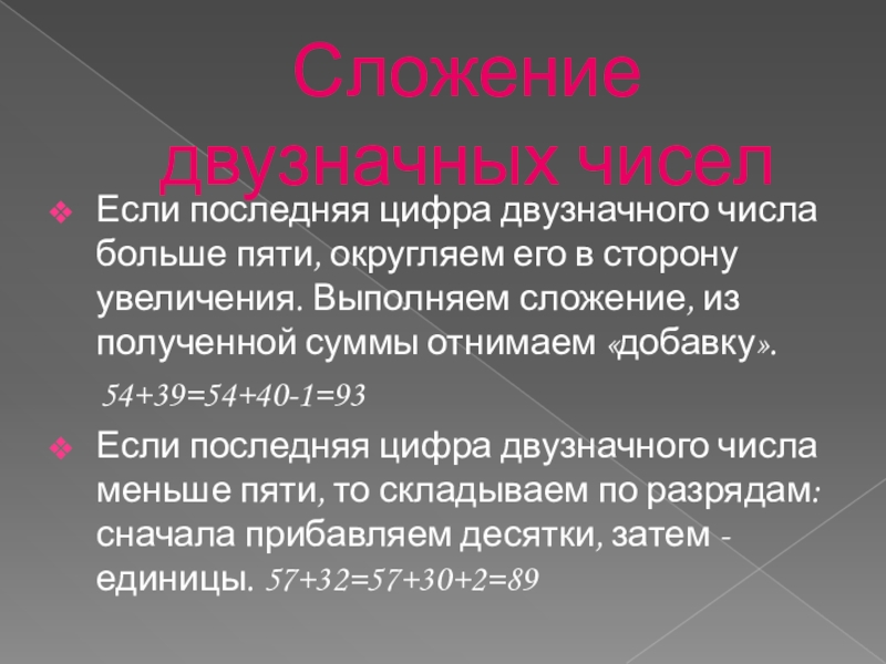 Если последняя цифра двузначного числа меньше пяти, то складываем по разрядам: сначала прибавляем десятки, затем - единицы. 57+32=57+30+2=89