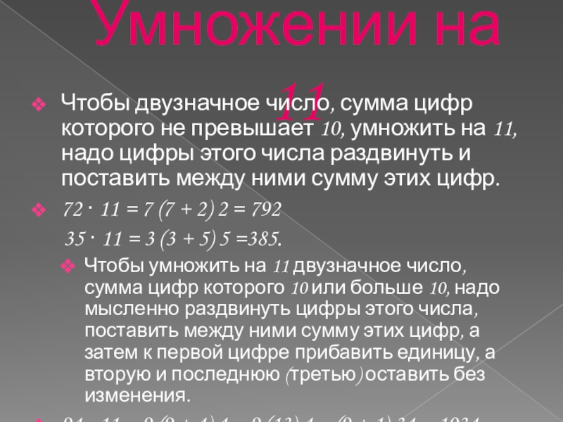 Чтобы умножить на 11 двузначное число, сумма цифр которого 10 или больше 10, надо мысленно раздвинуть цифры этого числа, поставить между ними сумму этих цифр, а затем к первой цифре прибавить единицу, а вторую и последнюю (третью) оставить без изменения.