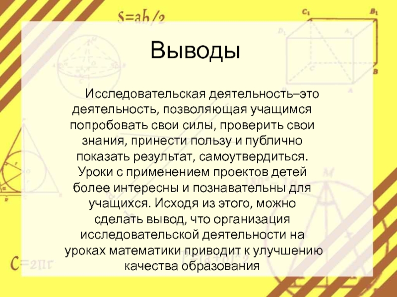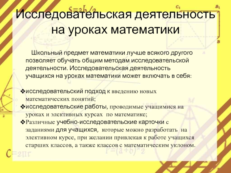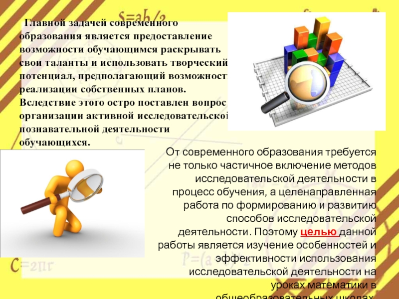 От современного образования требуется не только частичное включение методов исследовательской деятельности в процесс обучения, а целенаправленная работа по формированию и развитию способов исследовательской деятельности. Поэтому целью данной работы является изучение особенностей и эффективности использования исследовательской деятельности на уроках математики в общеобразовательных школах.