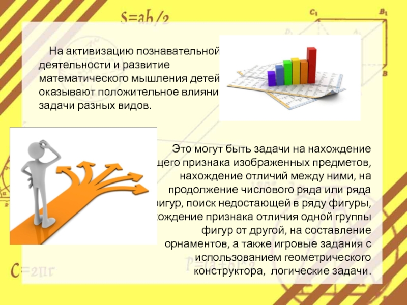Это могут быть задачи на нахождение общего признака изображенных предметов, нахождение отличий между ними, на продолжение числового ряда или ряда фигур, поиск недостающей в ряду фигуры, нахождение признака отличия одной группы фигур от другой, на составление орнаментов, а также игровые задания с использованием геометрического конструктора, логические задачи.