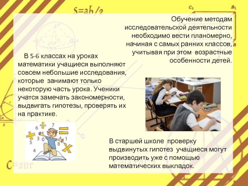 В старшей школе проверку выдвинутых гипотез учащиеся могут производить уже с помощью математических выкладок.