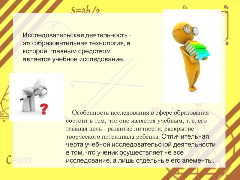 Особенность исследования в сфере образования состоит в том, что оно является учебным, т. е. его главная цель - развитие личности, раскрытие творческого потенциала ребенка. Отличительная черта учебной исследовательской деятельности в том, что ученик осуществляет не все исследование, а лишь отдельные его элементы.