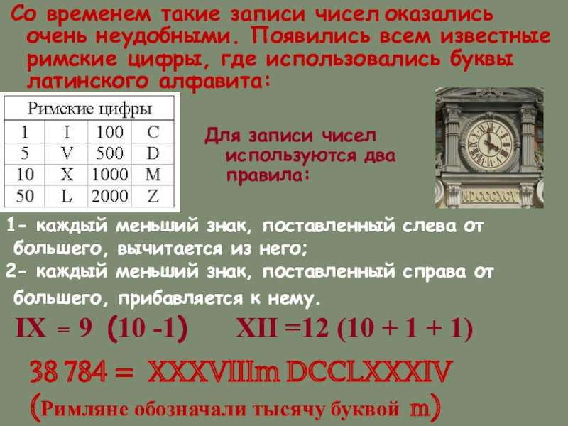 Со временем такие записи чисел оказались очень неудобными. Появились всем известные римские цифры, где использовались буквы латинского алфавита: