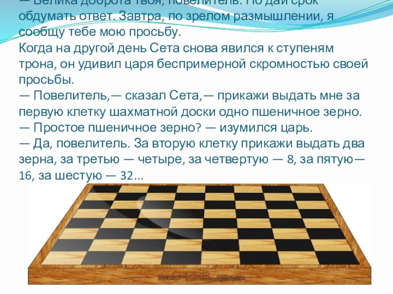 зерна за все 64 клетки доски, согласно твоему желанию: за каждую вдвое больше против предыдущей. Но знай, что просьба твоя недостойна моей щедрости. Прося такую ничтожную награду, ты непочтительно пренебрегаешь моей милостью. Поистине, как учитель, ты мог бы показать лучший пример уважения к доброте своего государя. Ступай! Слуги мои вынесут тебе мешок с пшеницей.
