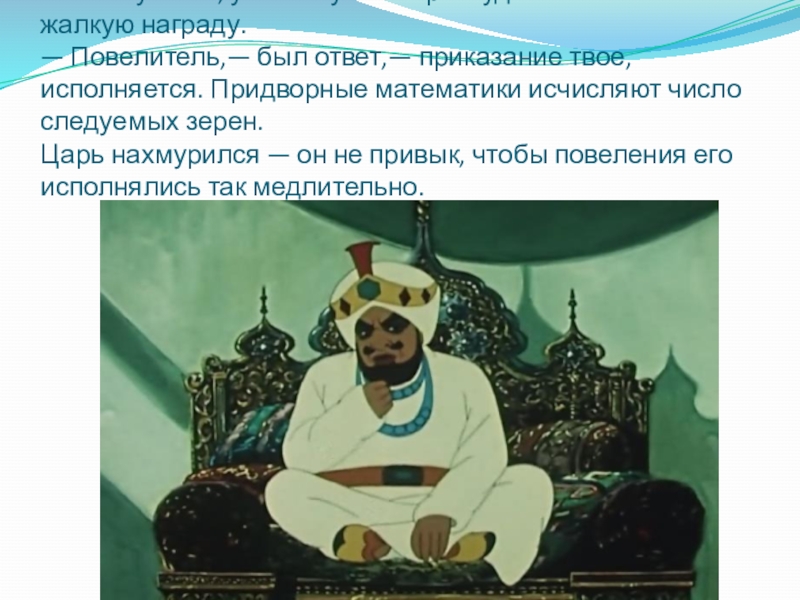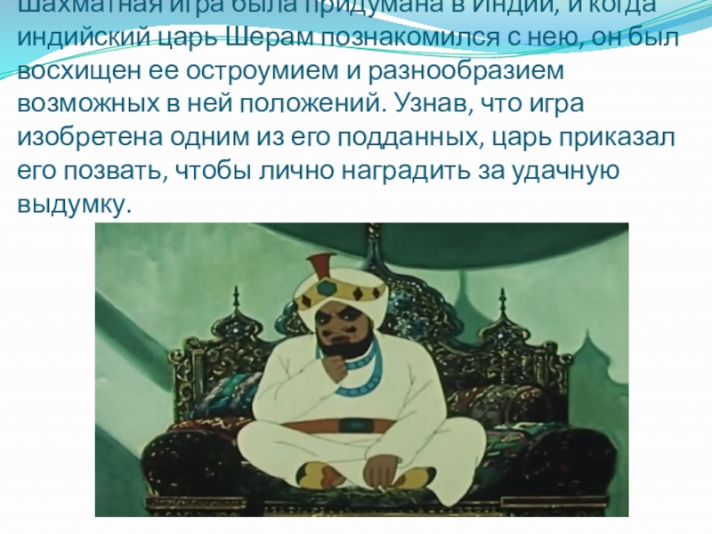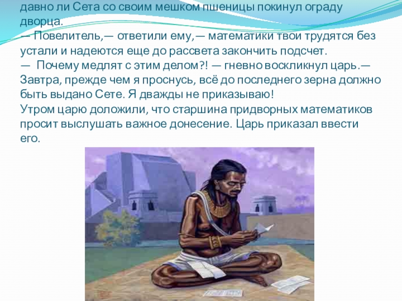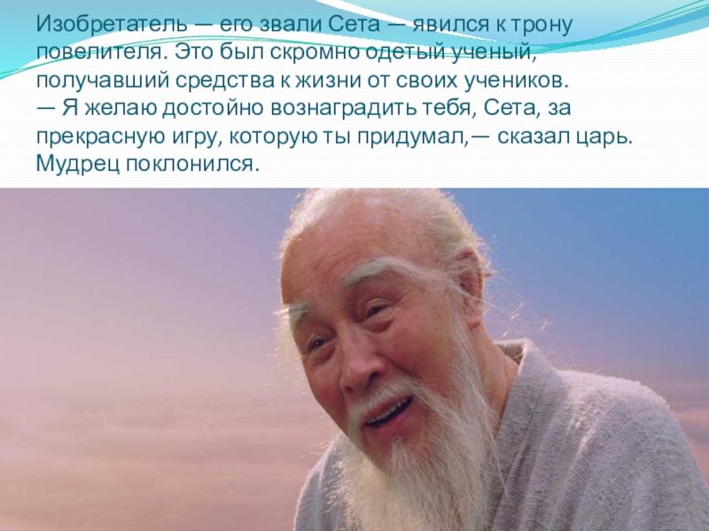Слайд 4Изобретатель — его звали Сета — явился к трону повелителя. Это