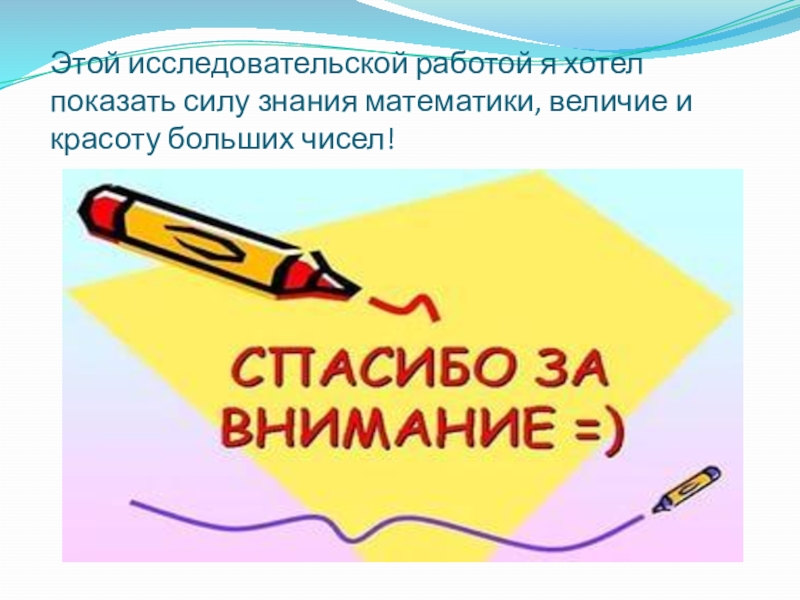 Слайд 22Этой исследовательской работой я хотел показать силу знания математики, величие и