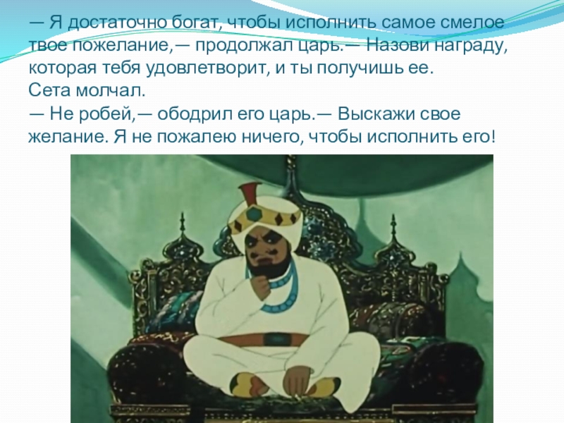 Слайд 5— Я достаточно богат, чтобы исполнить самое смелое твое пожелание,— продолжал
