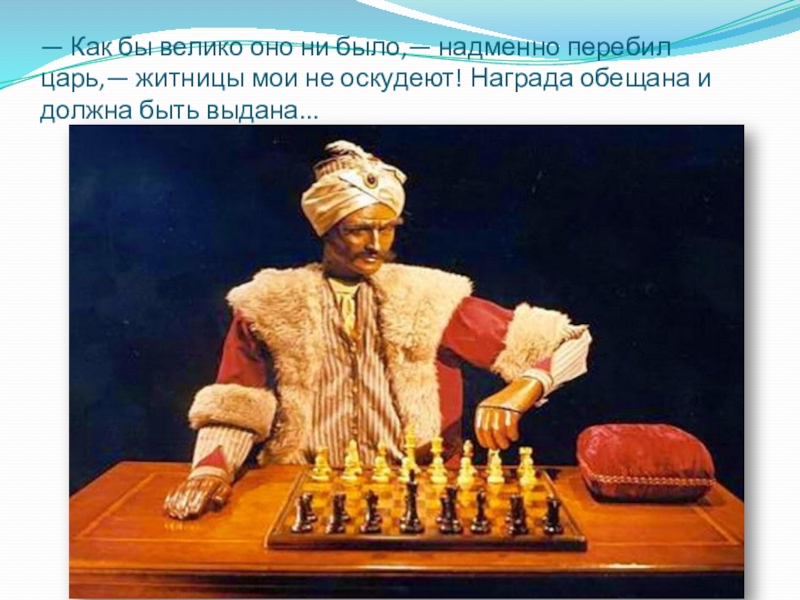 — Повелитель,— был ответ,— приказание твое, исполняется. Придворные математики исчисляют число следуемых зерен.