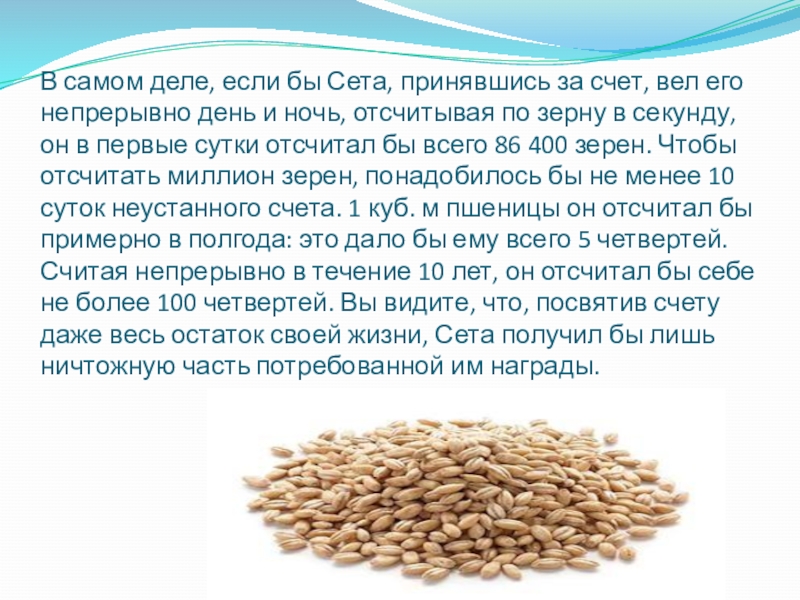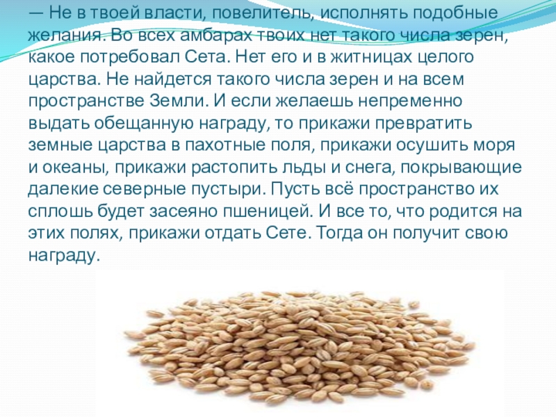 амбарах твоих нет такого числа зерен, какое потребовал Сета. Нет его и в житницах целого царства. Не найдется такого числа зерен и на всем пространстве Земли. И если желаешь непременно выдать обещанную награду, то прикажи превратить земные царства в пахотные поля, прикажи осушить моря и океаны, прикажи растопить льды и снега, покрывающие далекие северные пустыри. Пусть всё пространство их сплошь будет засеяно пшеницей. И все то, что родится на этих полях, прикажи отдать Сете. Тогда он получит свою награду.
