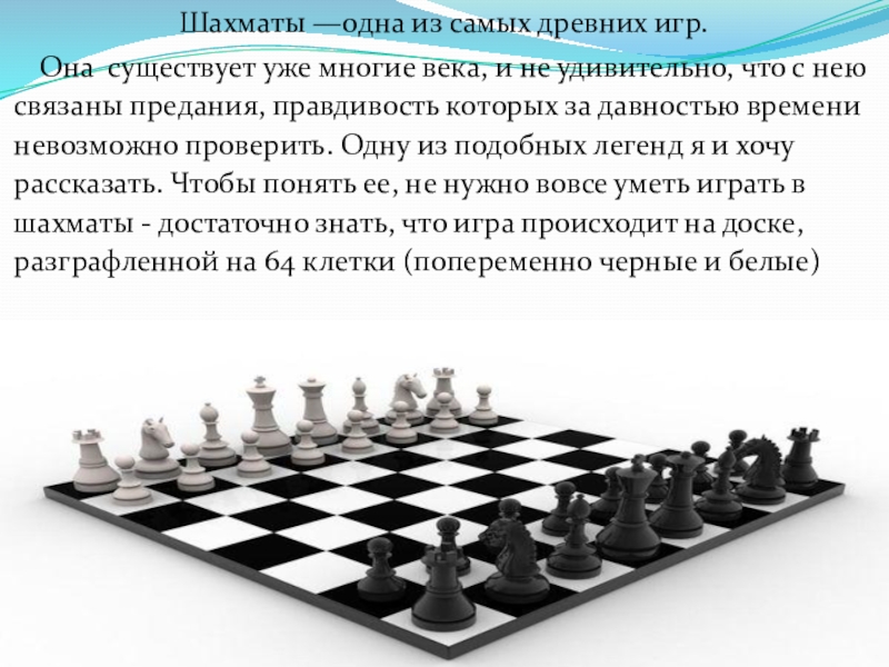 Она существует уже многие века, и не удивительно, что с нею связаны предания, правдивость которых за давностью времени невозможно проверить. Одну из подобных легенд я и хочу рассказать. Чтобы понять ее, не нужно вовсе уметь играть в шахматы - достаточно знать, что игра происходит на доске, разграфленной на 64 клетки (попеременно черные и белые)