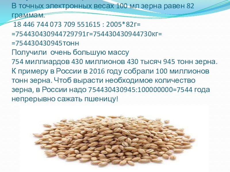 К примеру в России в 2016 году собрали 100 миллионов тонн зерна. Чтоб вырасти необходимое количество зерна, в России надо 754430430945:100000000=7544 года непрерывно сажать пшеницу!