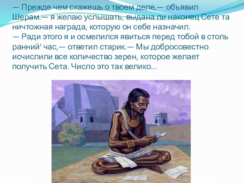— Ради этого я и осмелился явиться перед тобой в столь ранний' час,— ответил старик.— Мы добросовестно исчислили все количество зерен, которое желает получить Сета. Число это так велико...