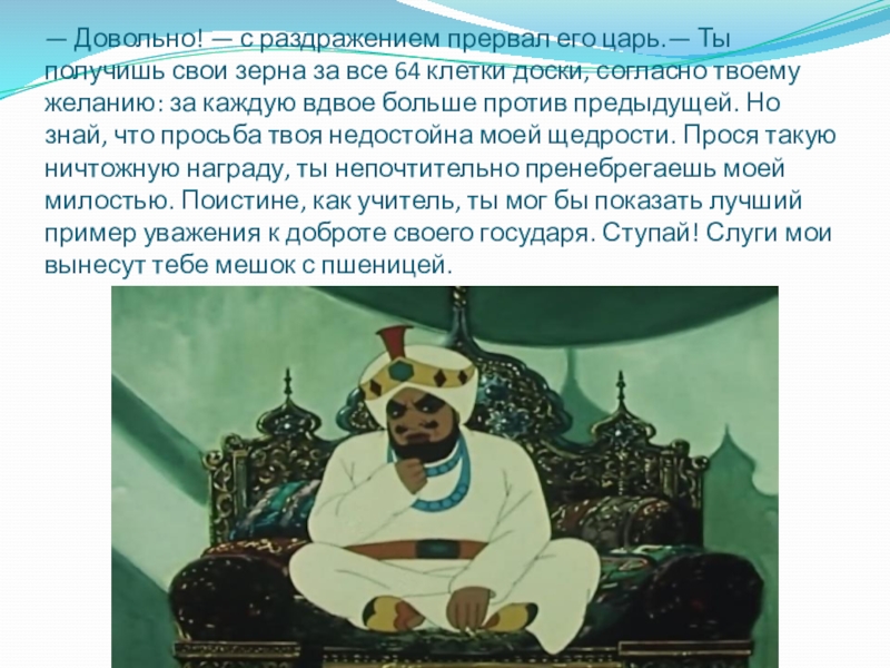 Слайд 7— Довольно! — с раздражением прервал его царь.— Ты получишь свои