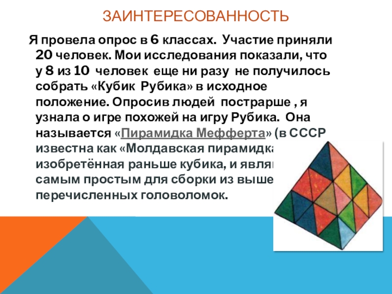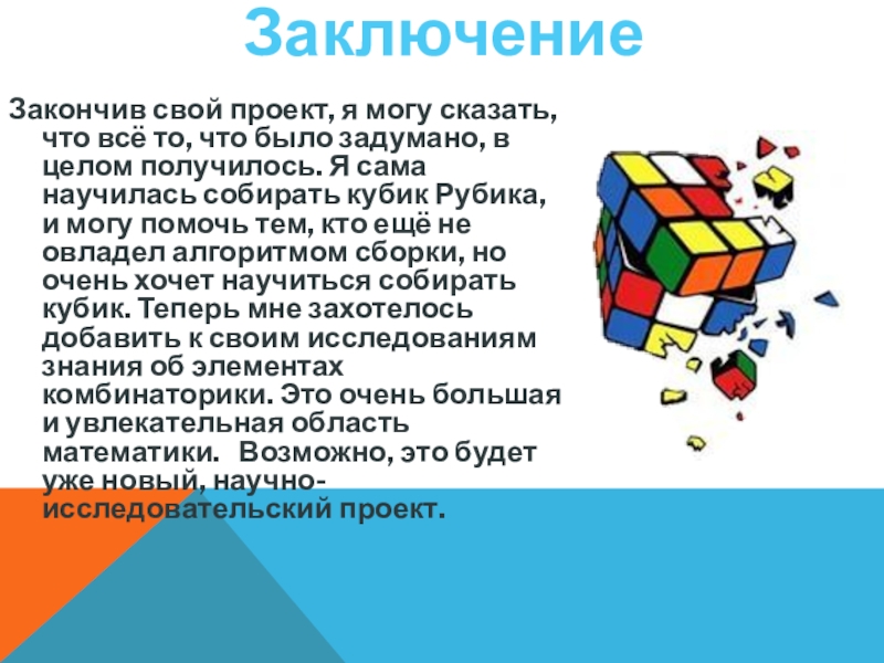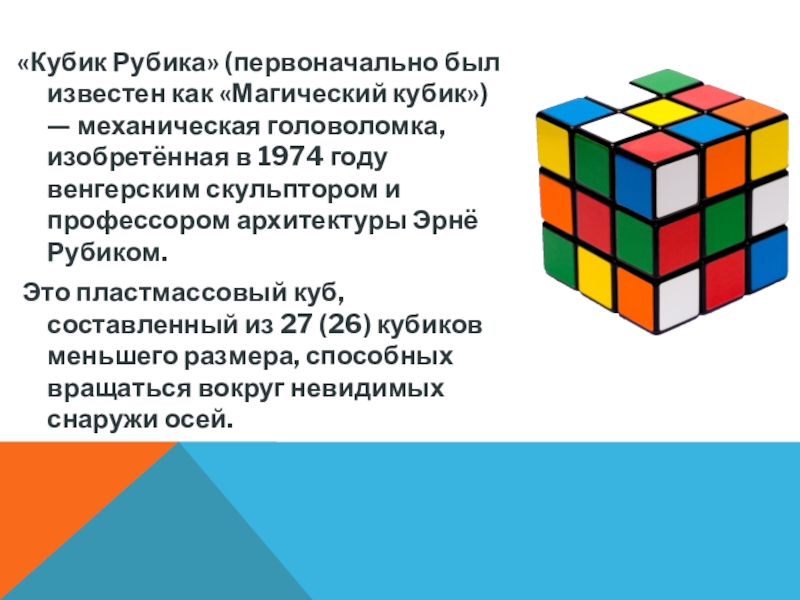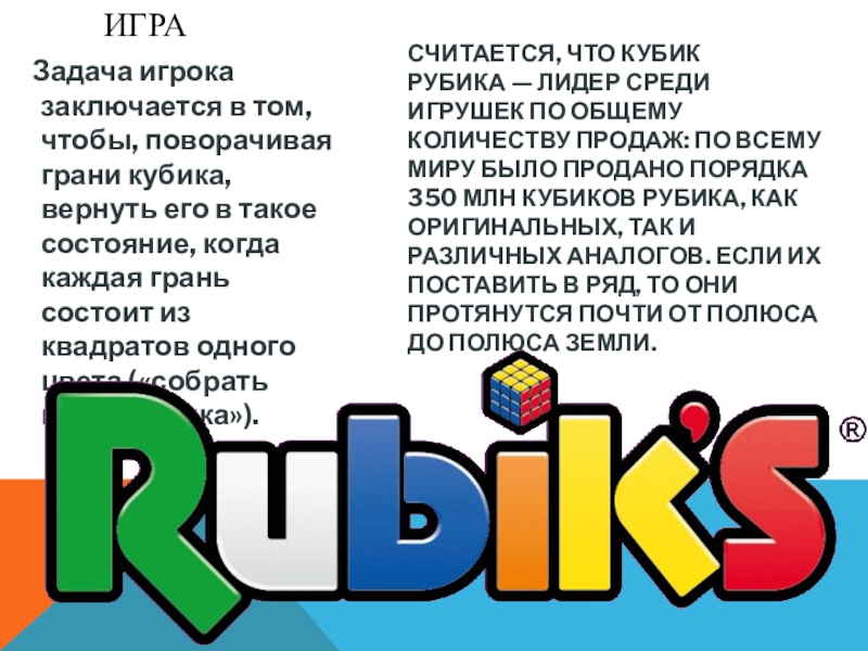Задача игрока заключается в том, чтобы, поворачивая грани кубика, вернуть его в такое состояние, когда каждая грань состоит из квадратов одного цвета («собрать кубик Рубика»).