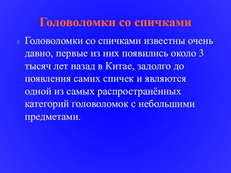 Головоломки со спичками Головоломки со спичками известны очень давно, первые из них появились около 3 тысяч лет