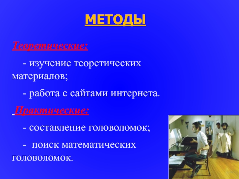 МЕТОДЫТеоретические:	- изучение теоретических материалов; 	- работа с сайтами интернета. Практические:  - составление головоломок;	- поиск математических головоломок.
