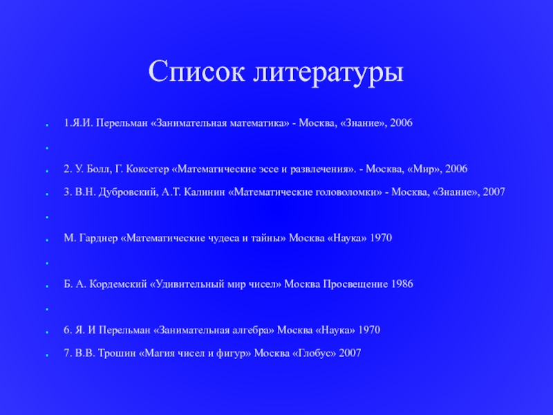 Список литературы1.Я.И. Перельман «Занимательная математика» - Москва, «Знание», 2006 2. У. Болл, Г. Коксетер «Математические эссе и развлечения». -