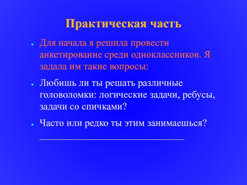 Практическая часть Для начала я решила провести анкетирование среди одноклассников. Я задала им такие вопросы: Любишь ли