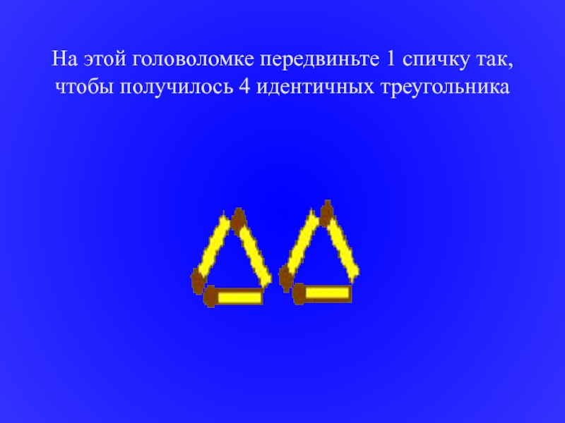 Слайд 18На этой головоломке передвиньте 1 спичку так, чтобы получилось 4 идентичных