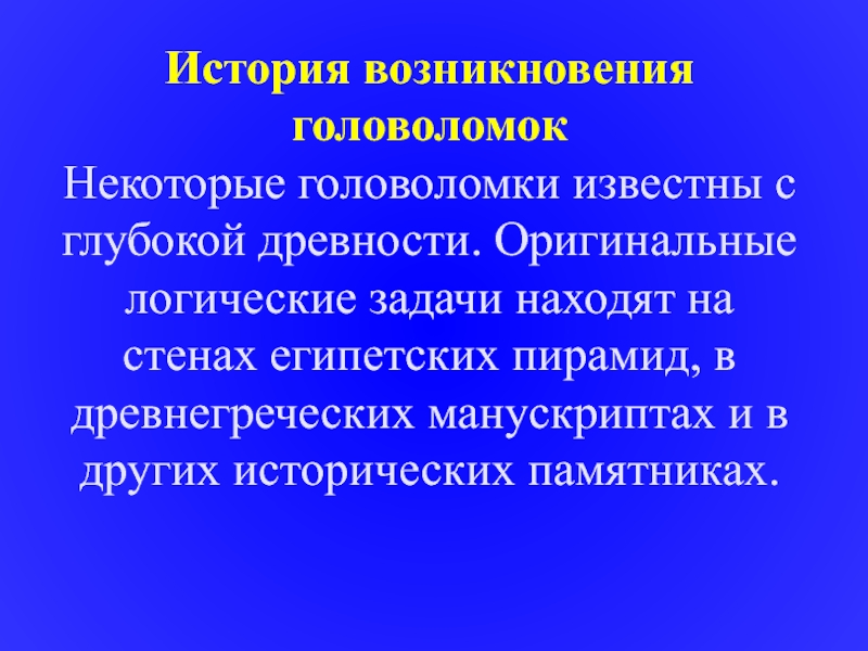История возникновения головоломок Некоторые головоломки известны с глубокой древности. Оригинальные логические задачи находят на стенах египетских пирамид,