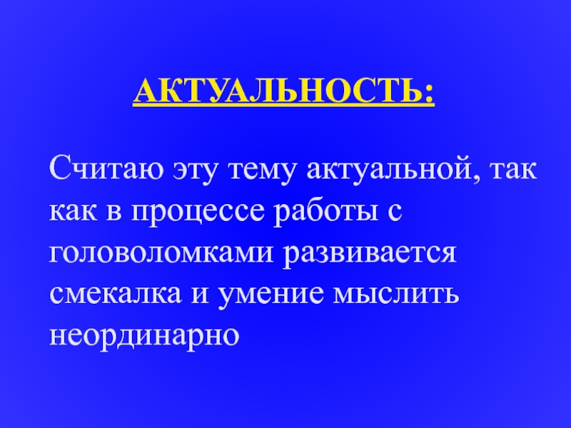 АКТУАЛЬНОСТЬ:Считаю эту тему актуальной, так как в процессе работы с головоломками развивается смекалка и умение мыслить неординарно