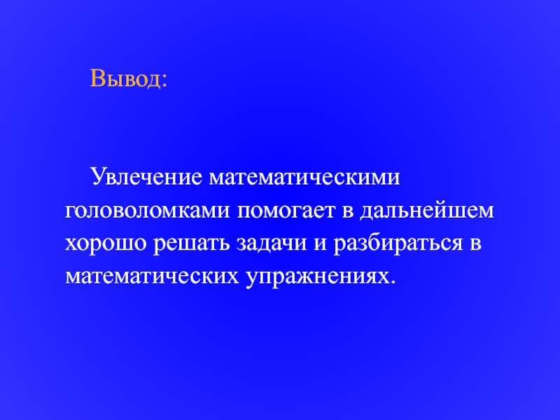 Вывод:Увлечение математическими головоломками помогает в дальнейшем хорошо решать задачи и разбираться в математических упражнениях.