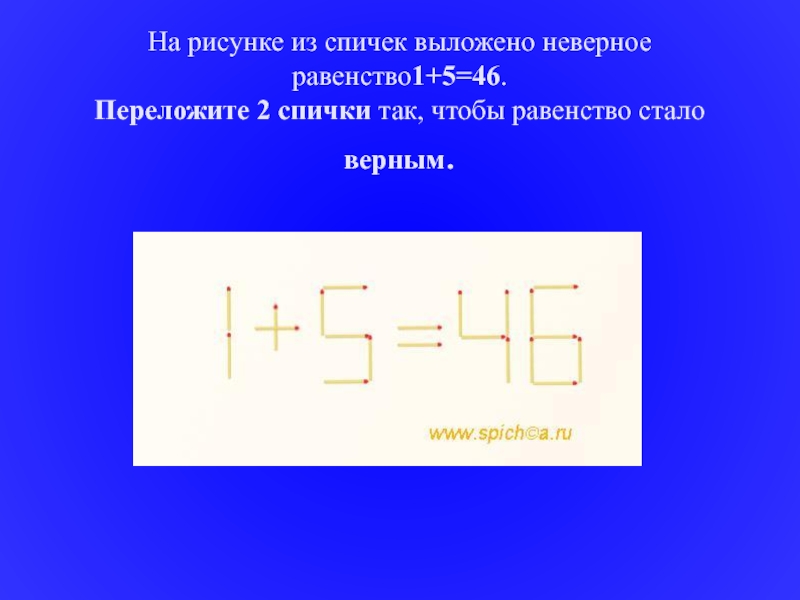 Слайд 17На рисунке из спичек выложено неверное равенство1+5=46. Переложите 2 спички так, чтобы равенство