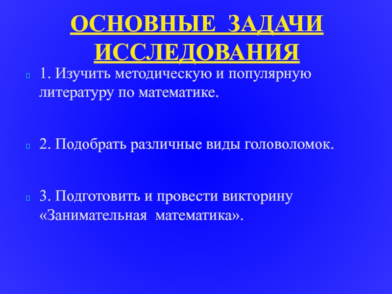 ОСНОВНЫЕ ЗАДАЧИ ИССЛЕДОВАНИЯ1. Изучить методическую и популярную литературу по математике.2. Подобрать различные виды головоломок.3. Подготовить и провести