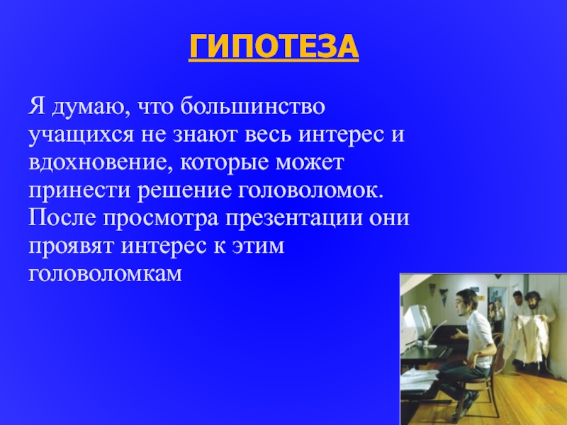 ГИПОТЕЗАЯ думаю, что большинство учащихся не знают весь интерес и вдохновение, которые может принести решение головоломок. После