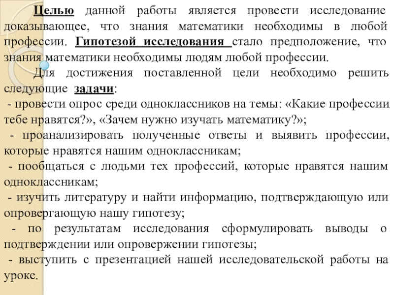 математики необходимы в любой профессии. Гипотезой исследования стало предположение, что знания математики необходимы людям любой профессии.