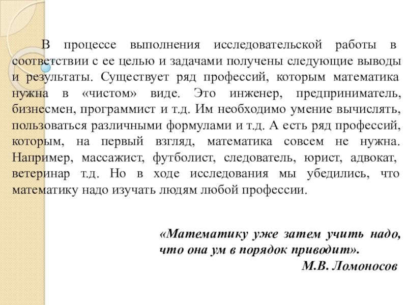 целью и задачами получены следующие выводы и результаты. Существует ряд профессий, которым математика нужна в «чистом» виде. Это инженер, предприниматель, бизнесмен, программист и т.д. Им необходимо умение вычислять, пользоваться различными формулами и т.д. А есть ряд профессий, которым, на первый взгляд, математика совсем не нужна. Например, массажист, футболист, следователь, юрист, адвокат, ветеринар т.д. Но в ходе исследования мы убедились, что математику надо изучать людям любой профессии.