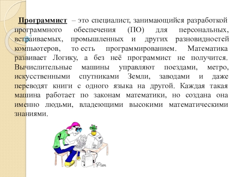 Слайд 10 Программист – это специалист, занимающийся разработкой программного обеспечения (ПО) для