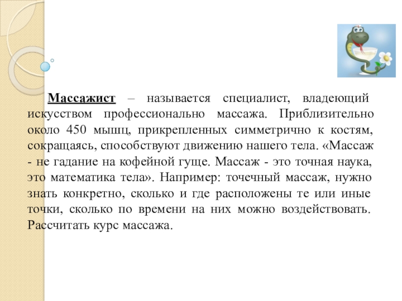 Слайд 13 Массажист – называется специалист, владеющий искусством профессионально массажа. Приблизительно около