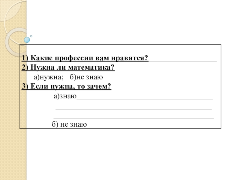 - провести опрос среди одноклассников на темы: «Какие профессии тебе нравятся?», «Зачем нужно изучать математику?»;