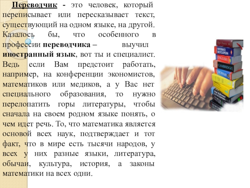 на одном языке, на другой. Казалось бы, что особенного в профессии переводчика – выучил иностранный язык, вот ты и специалист. Ведь если Вам предстоит работать, например, на конференции экономистов, математиков или медиков, а у Вас нет специального образования, то нужно перелопатить горы литературы, чтобы сначала на своем родном языке понять, о чем идет речь. То, что математика является основой всех наук, подтверждает и тот факт, что в мире есть тысячи народов, у всех у них разные языки, литература, обычаи, культура, история, а законы математики на всех одни.