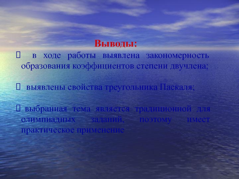 в ходе работы выявлена закономерность образования коэффициентов степени двучлена;