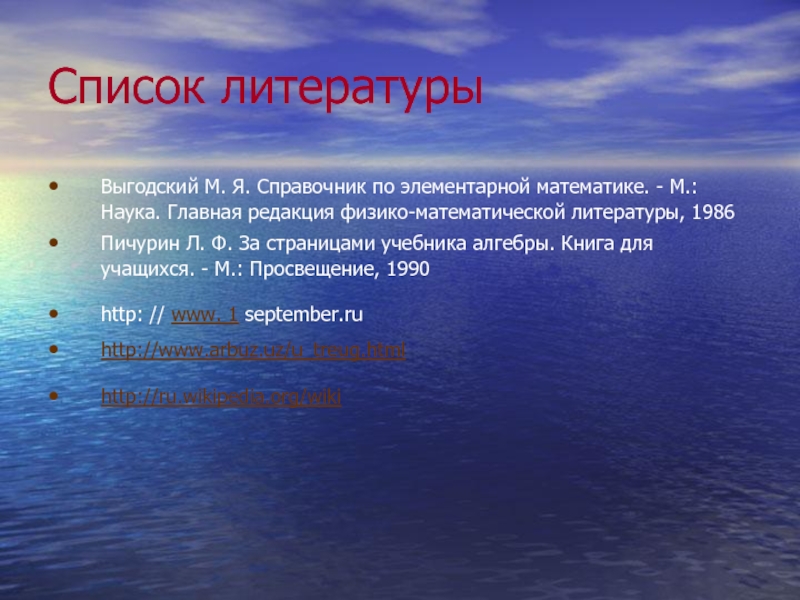 Пичурин Л. Ф. За страницами учебника алгебры. Книга для учащихся. - М.: Просвещение, 1990