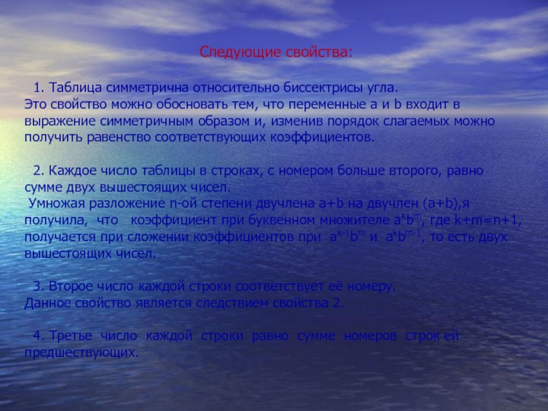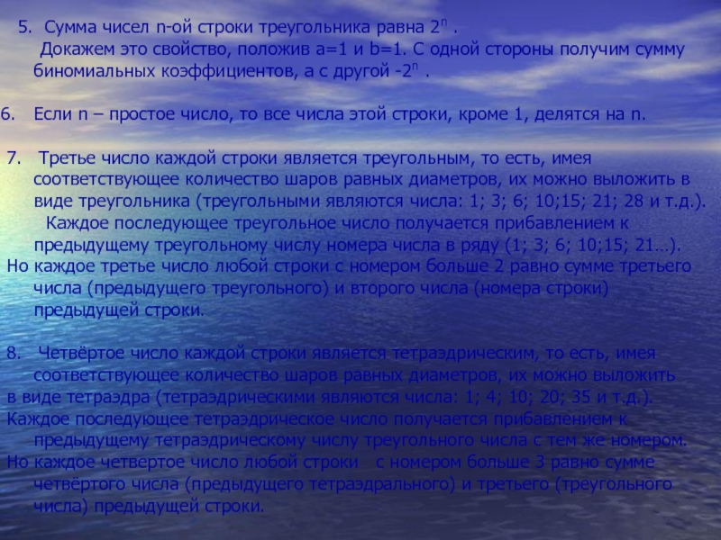 Свойства треугольника Паскаля: