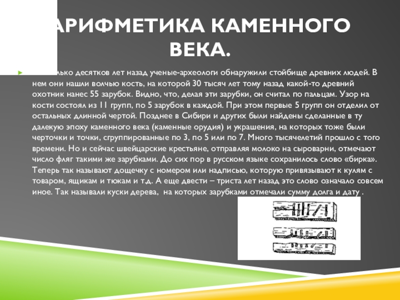 В нем они нашли волчью кость, на которой 30 тысяч лет тому назад какой-то древний охотник нанес 55 зарубок. Видно, что, делая эти зарубки, он считал по пальцам. Узор на кости состоял из 11 групп, по 5 зарубок в каждой. При этом первые 5 групп он отделил от остальных длинной чертой. Позднее в Сибири и других были найдены сделанные в ту далекую эпоху каменного века (каменные орудия) и украшения, на которых тоже были черточки и точки, сгруппированные по 3, по 5 или по 7. Много тысячелетий прошло с того времени. Но и сейчас швейцарские крестьяне, отправляя молоко на сыроварни, отмечают число фляг такими же зарубками. До сих пор в русском языке сохранилось слово «бирка». Теперь так называют дощечку с номером или надписью, которую привязывают к кулям с товаром, ящикам и тюкам и т.д. А еще двести – триста лет назад это слово означало совсем иное. Так называли куски дерева, на которых зарубками отмечали сумму долга и дату .