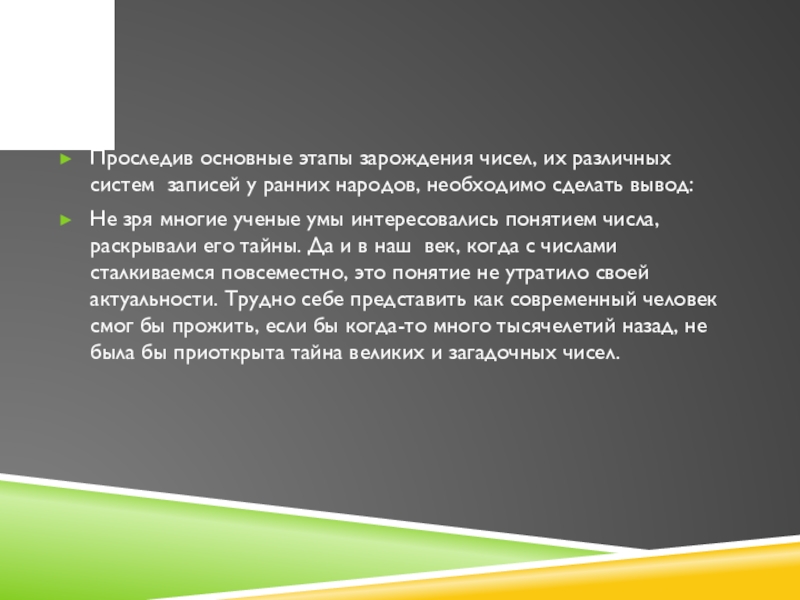 Слайд 25Проследив основные этапы зарождения чисел, их различных систем записей у ранних
