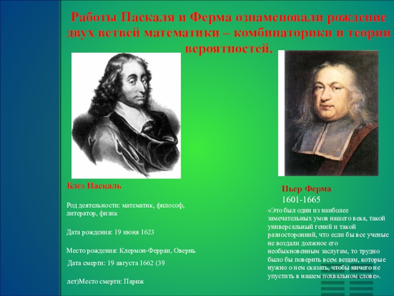Слайд 17Работы Паскаля и Ферма ознаменовали рождение двух ветвей математики – комбинаторики