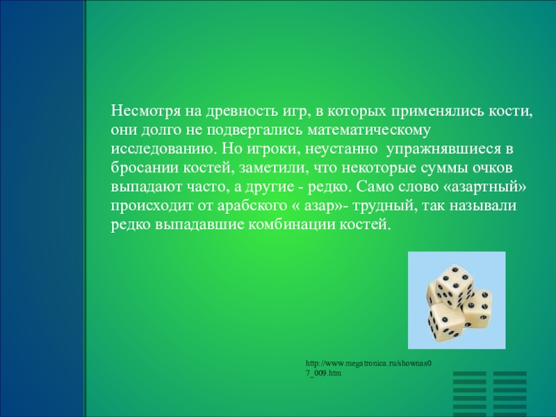 подвергались математическому исследованию. Но игроки, неустанно упражнявшиеся в бросании костей, заметили, что некоторые суммы очков выпадают часто, а другие - редко. Само слово «азартный» происходит от арабского « азар»- трудный, так называли редко выпадавшие комбинации костей.
