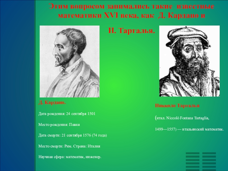 Этим вопросом занимались такие известные математики XVI века, как Д. Кардано